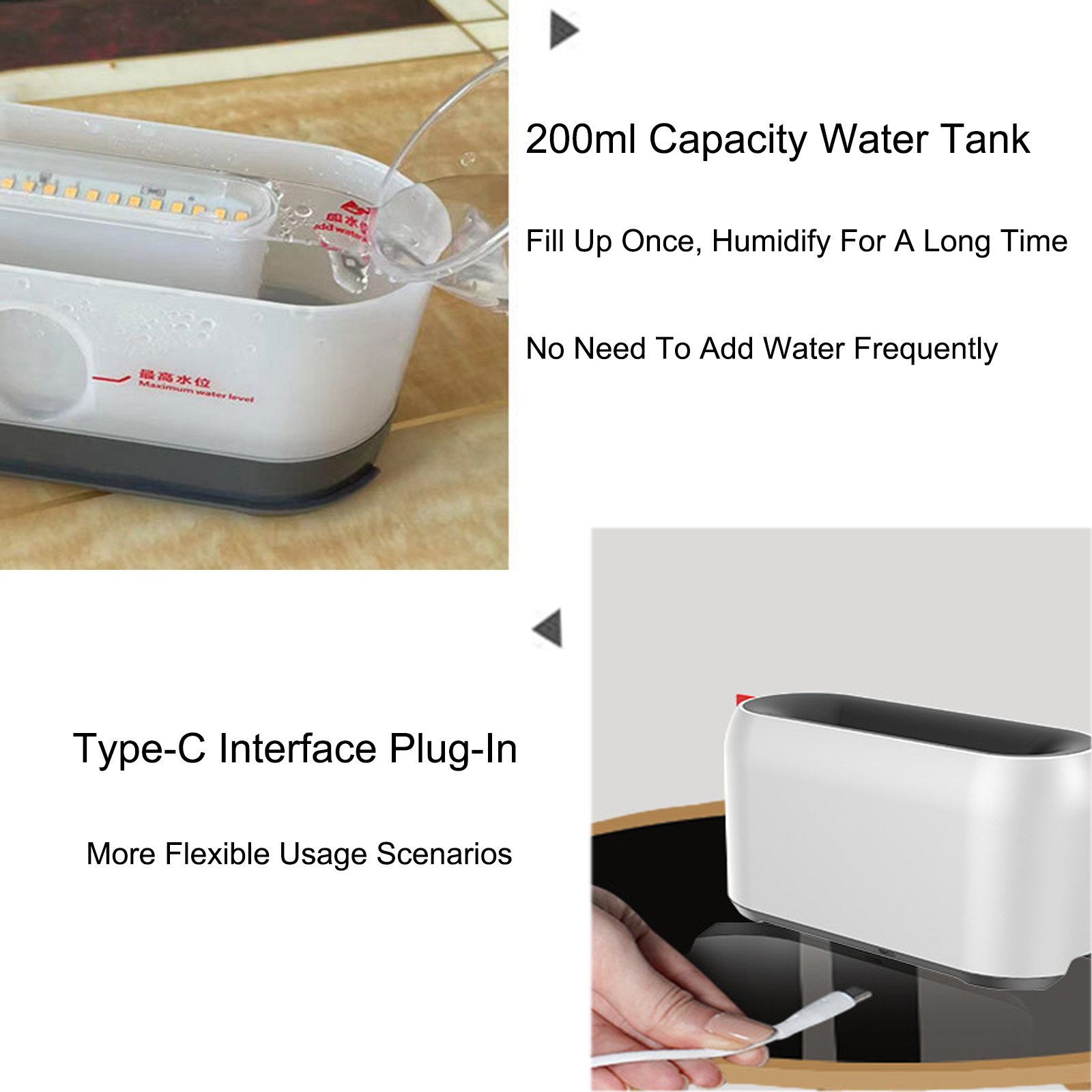 • 200ml Capacity: A sufficient water tank allows for several hours of continuous use, making it ideal for overnight operation or long periods without refilling.